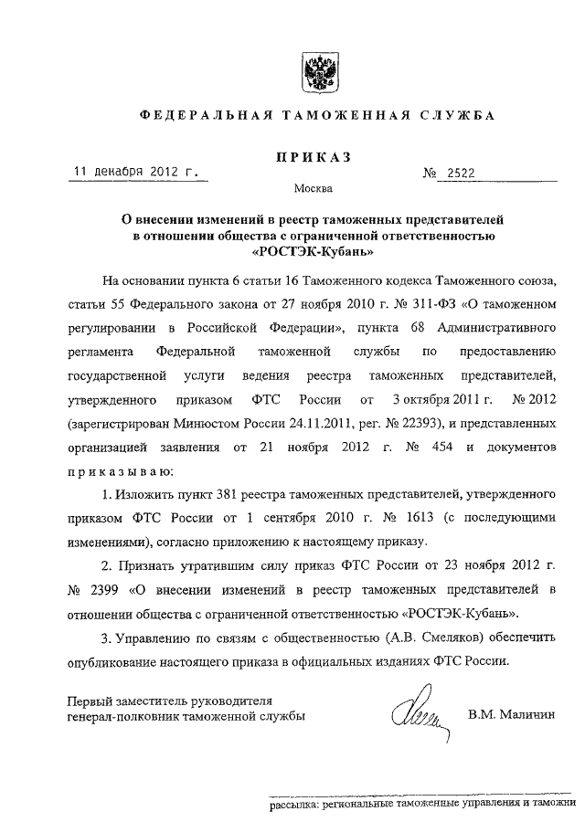 ПРИКАЗ ФТС РФ от 11.12.2012 N 2522