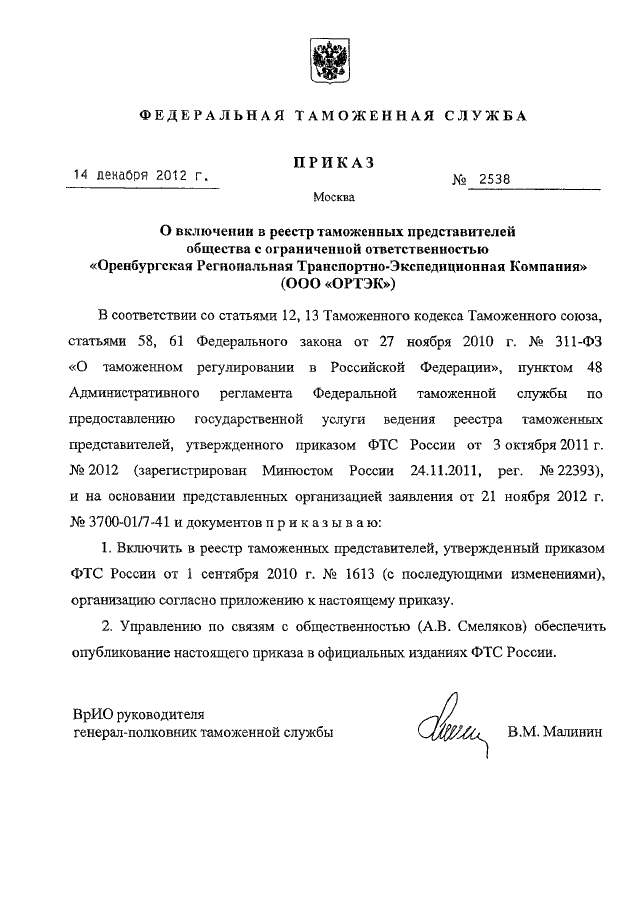 ПРИКАЗ ФТС РФ от 14.12.2012 N 2538