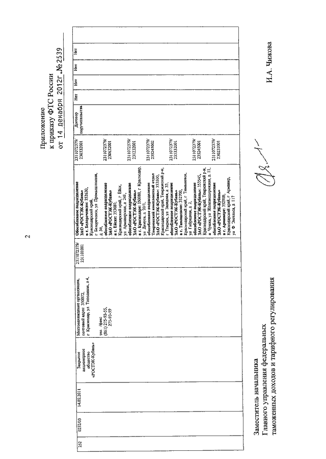 ПРИКАЗ ФТС РФ от 14.12.2012 N 2539