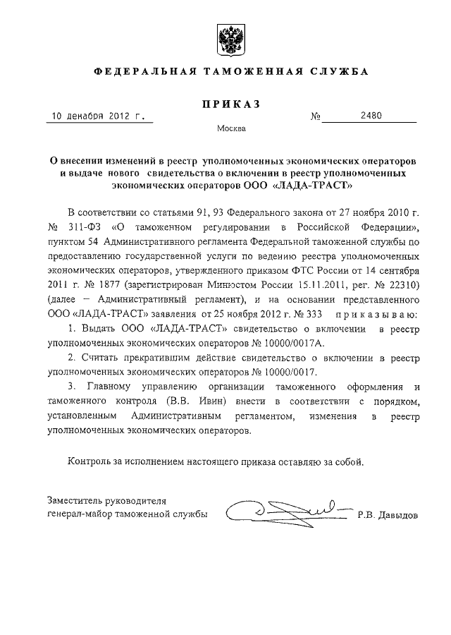 "О ВНЕСЕНИИ ИЗМЕНЕНИЙ В РЕЕСТР УПОЛНОМОЧЕННЫХ ЭКОНОМИЧЕСКИХ ОПЕРАТОРОВ И ВЫДАЧЕ НОВОГО СВИДЕТЕЛЬСТВА О ВКЛЮЧЕНИИ В РЕЕСТР УПОЛНОМОЧЕННЫХ ЭКОНОМИЧЕСКИХ ОПЕРАТОРОВ ООО "ЛАДА-ТРАСТ"