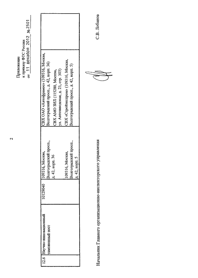 ПРИКАЗ ФТС РФ от 11.12.2012 N 2501