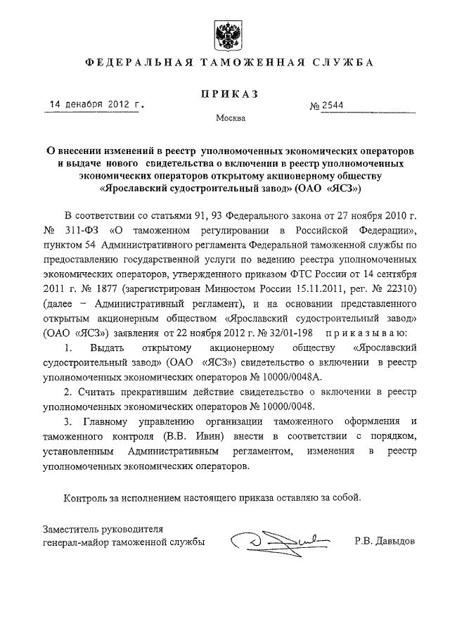 ПРИКАЗ ФТС РФ от 14.12.2012 N 2544 "О ВНЕСЕНИИ ИЗМЕНЕНИЙ В РЕЕСТР УПОЛНОМОЧЕННЫХ ЭКОНОМИЧЕСКИХ