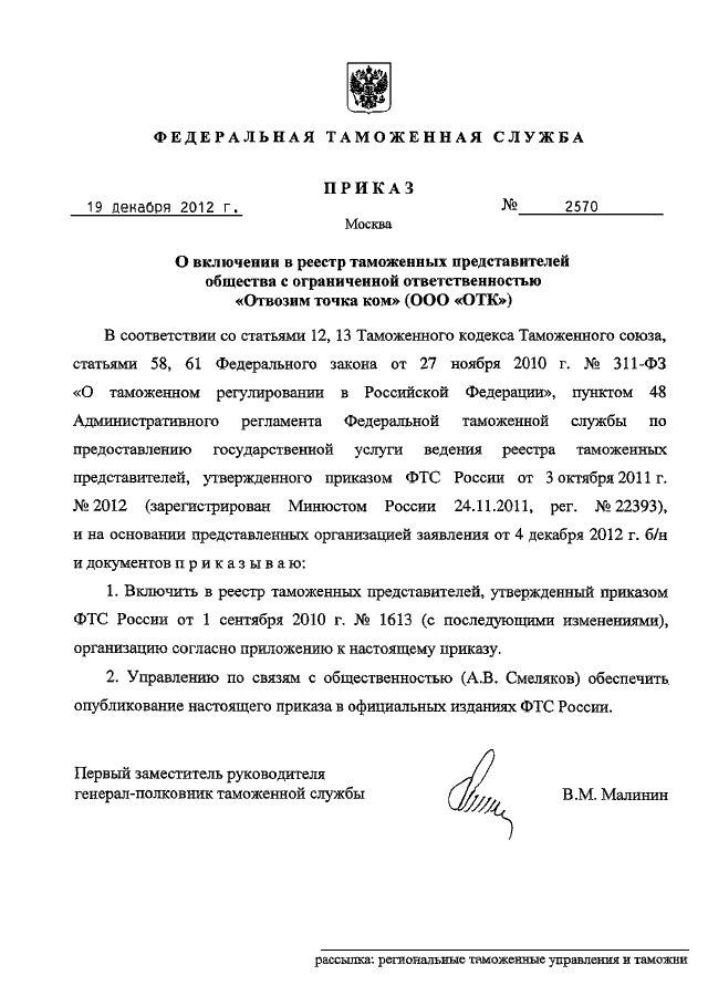 ПРИКАЗ ФТС РФ от 19.12.2012 N 2570