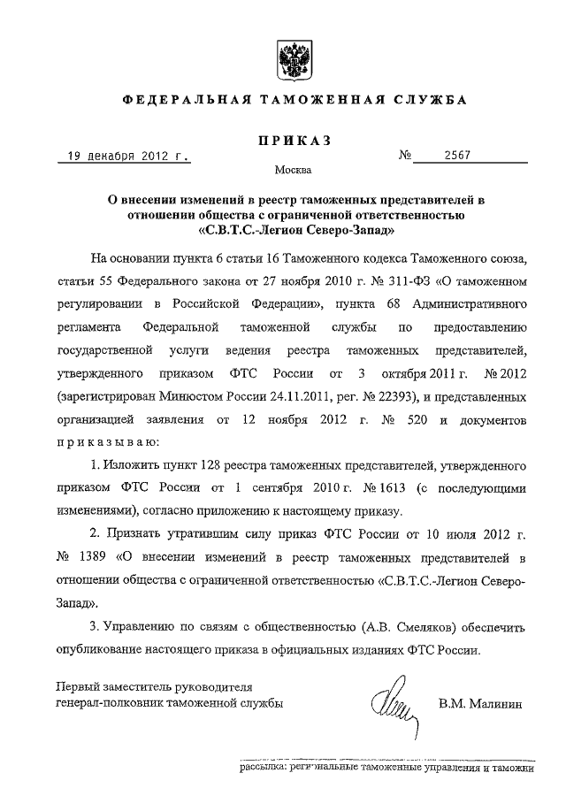 "О ВНЕСЕНИИ ИЗМЕНЕНИЙ В РЕЕСТР ТАМОЖЕННЫХ ПРЕДСТАВИТЕЛЕЙ В ОТНОШЕНИИ ОБЩЕСТВА С ОГРАНИЧЕННОЙ ОТВЕТСТВЕННОСТЬЮ "С.В.Т.С.-ЛЕГИОН СЕВЕРО-ЗАПАД"
