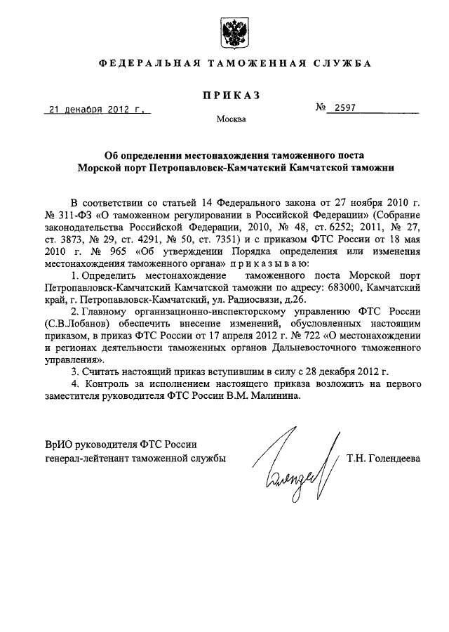 "ОБ ОПРЕДЕЛЕНИИ МЕСТОНАХОЖДЕНИЯ ТАМОЖЕННОГО ПОСТА МОРСКОЙ ПОРТ ПЕТРОПАВЛОВСК-КАМЧАТСКИЙ КАМЧАТСКОЙ ТАМОЖНИ"