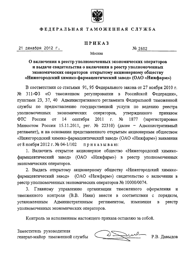 ПРИКАЗ ФТС РФ от 21.12.2012 N 2602 "О ВКЛЮЧЕНИИ В РЕЕСТР УПОЛНОМОЧЕННЫХ ЭКОНОМИЧЕСКИХ ОПЕРАТОРОВ И