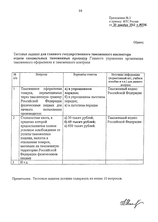 ПРИКАЗ ФТС РФ от 20.12.2012 N 2596