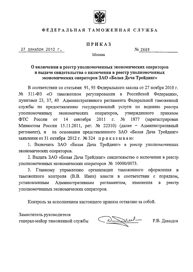 "О ВКЛЮЧЕНИИ В РЕЕСТР УПОЛНОМОЧЕННЫХ ЭКОНОМИЧЕСКИХ ОПЕРАТОРОВ И ВЫДАЧЕ СВИДЕТЕЛЬСТВА О ВКЛЮЧЕНИИ В РЕЕСТР УПОЛНОМОЧЕННЫХ ЭКОНОМИЧЕСКИХ ОПЕРАТОРОВ ЗАО "БЕЛАЯ ДАЧА ТРЕЙДИНГ"
