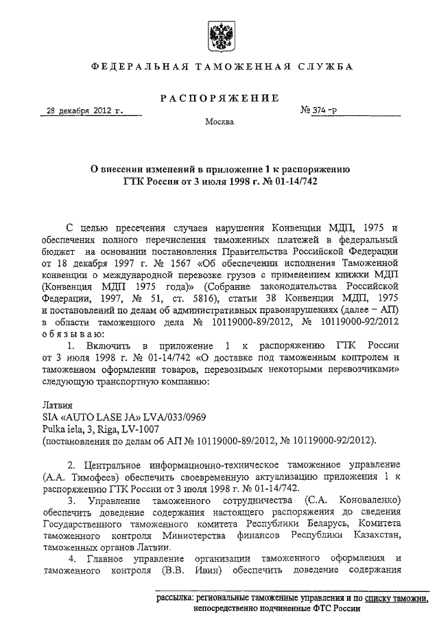 РАСПОРЯЖЕНИЕ ФТС РФ от 28.12.2012 N 374-р