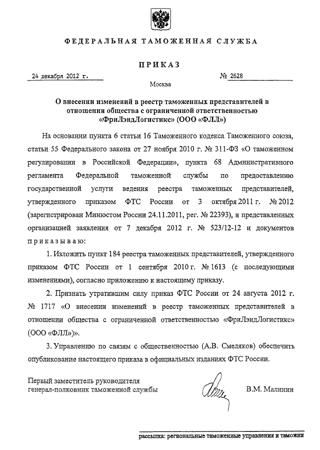 ПРИКАЗ ФТС РФ от 24.12.2012 N 2628