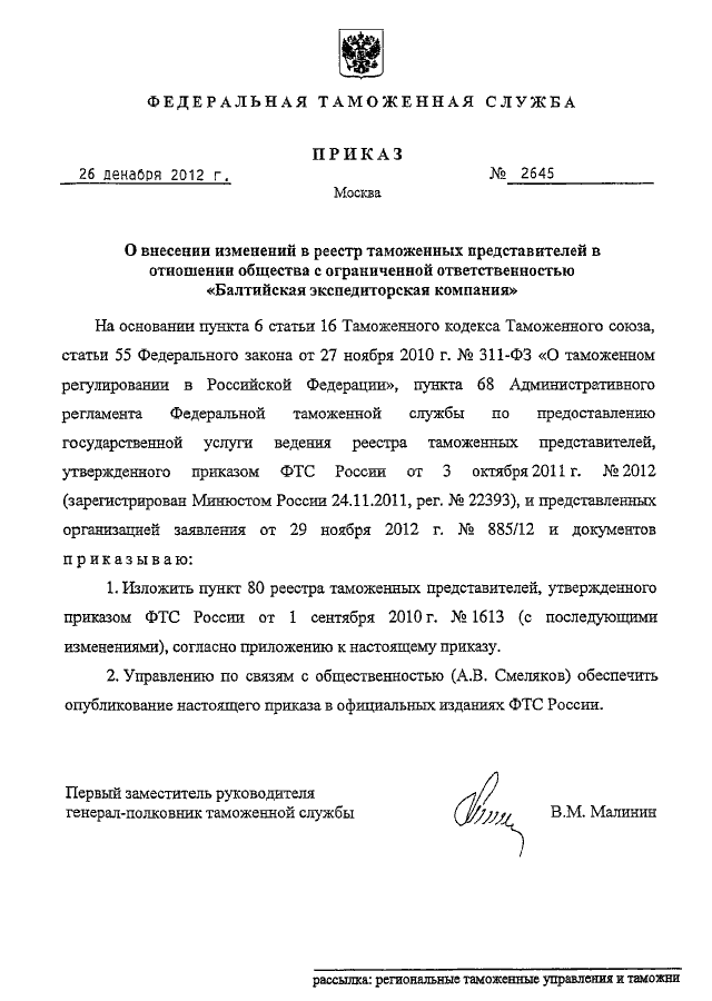 ПРИКАЗ ФТС РФ от 26.12.2012 N 2645