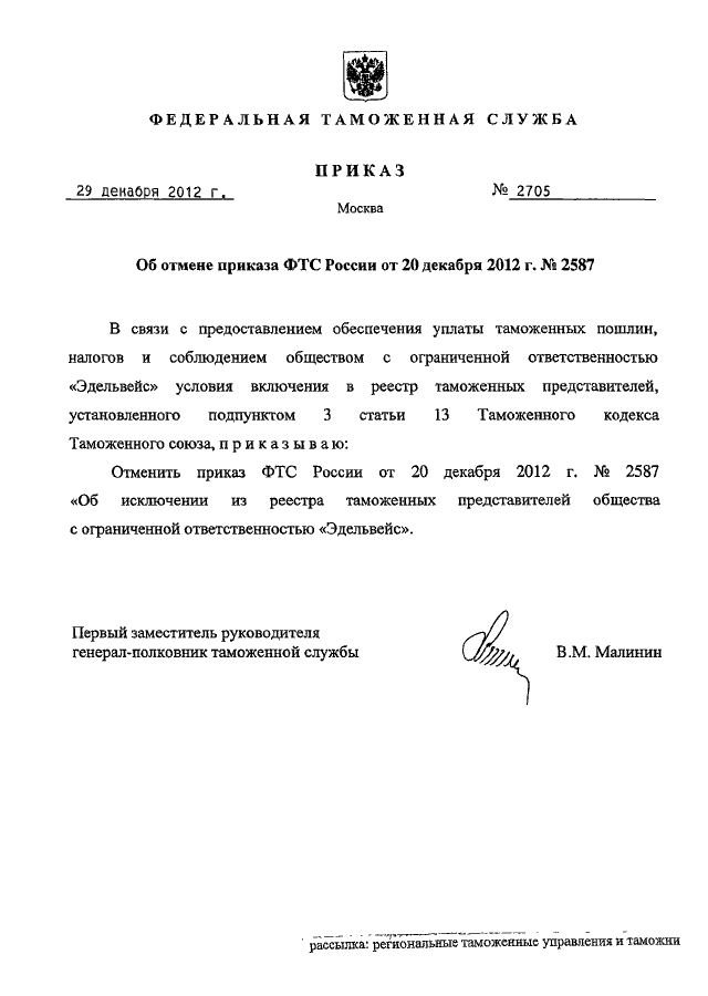 ПРИКАЗ ФТС РФ от 29.12.2012 N 2705