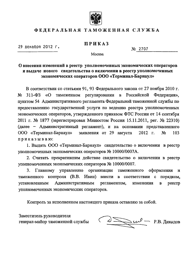 "О ВНЕСЕНИИ ИЗМЕНЕНИЙ В РЕЕСТР УПОЛНОМОЧЕННЫХ ЭКОНОМИЧЕСКИХ ОПЕРАТОРОВ И ВЫДАЧЕ НОВОГО СВИДЕТЕЛЬСТВА О ВКЛЮЧЕНИИ В РЕЕСТР УПОЛНОМОЧЕННЫХ ЭКОНОМИЧЕСКИХ ОПЕРАТОРОВ ООО "ТЕРМИНАЛ - БАРНАУЛ"