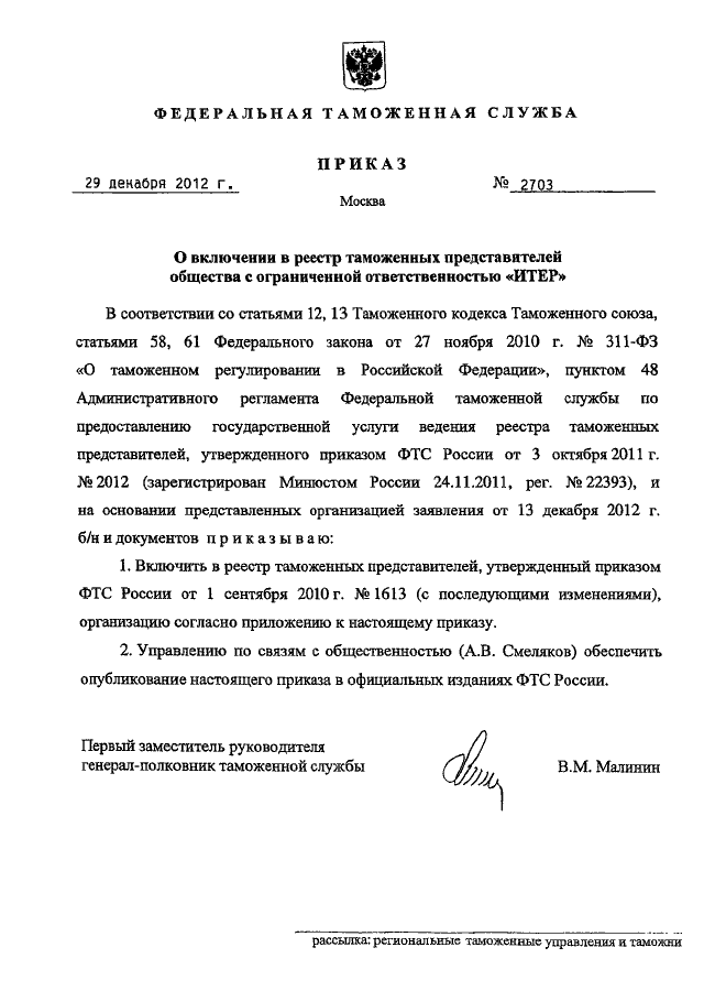 ПРИКАЗ ФТС РФ от 29.12.2012 N 2703