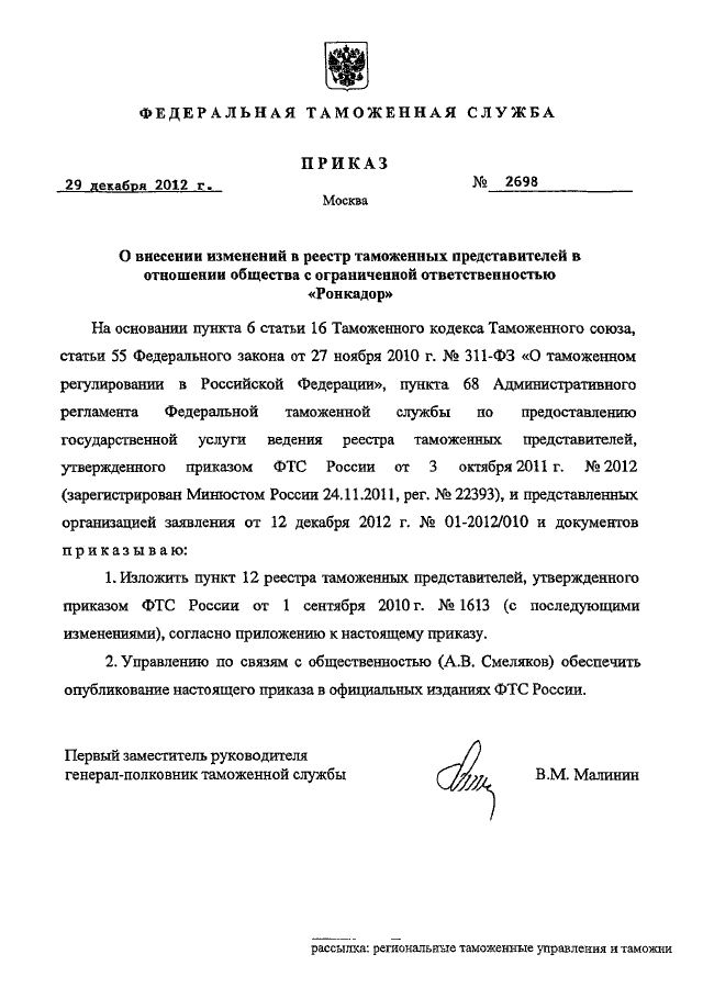 ПРИКАЗ ФТС РФ от 29.12.2012 N 2698