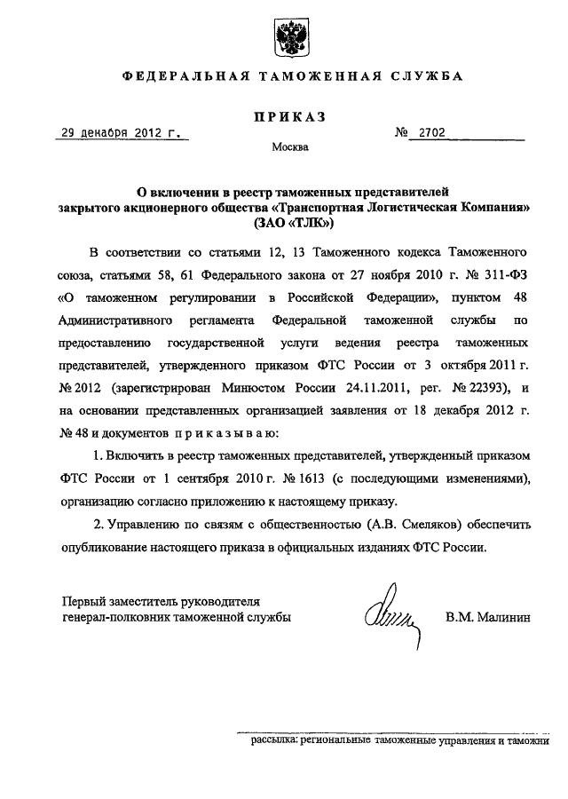 ПРИКАЗ ФТС РФ от 29.12.2012 N 2702