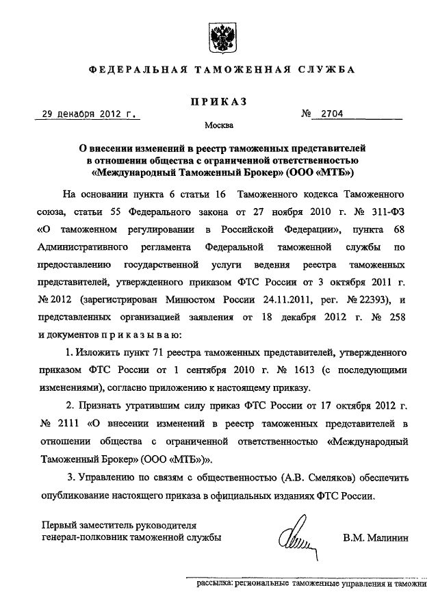 ПРИКАЗ ФТС РФ от 29.12.2012 N 2704