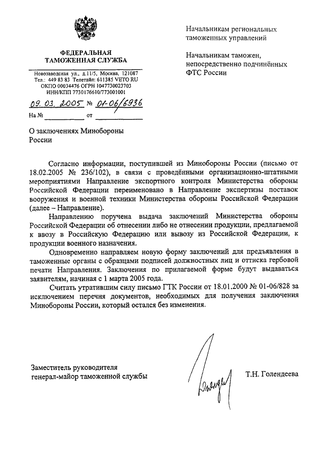 ПИСЬМО ФТС РФ от 09.03.2005 N 01-06/6936