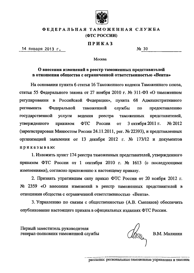 ПРИКАЗ ФТС РФ от 14.01.2013 N 30
