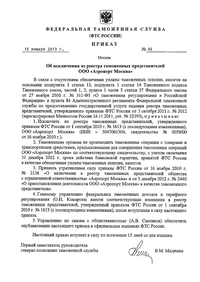 ПРИКАЗ ФТС РФ от 15.01.2013 N 46