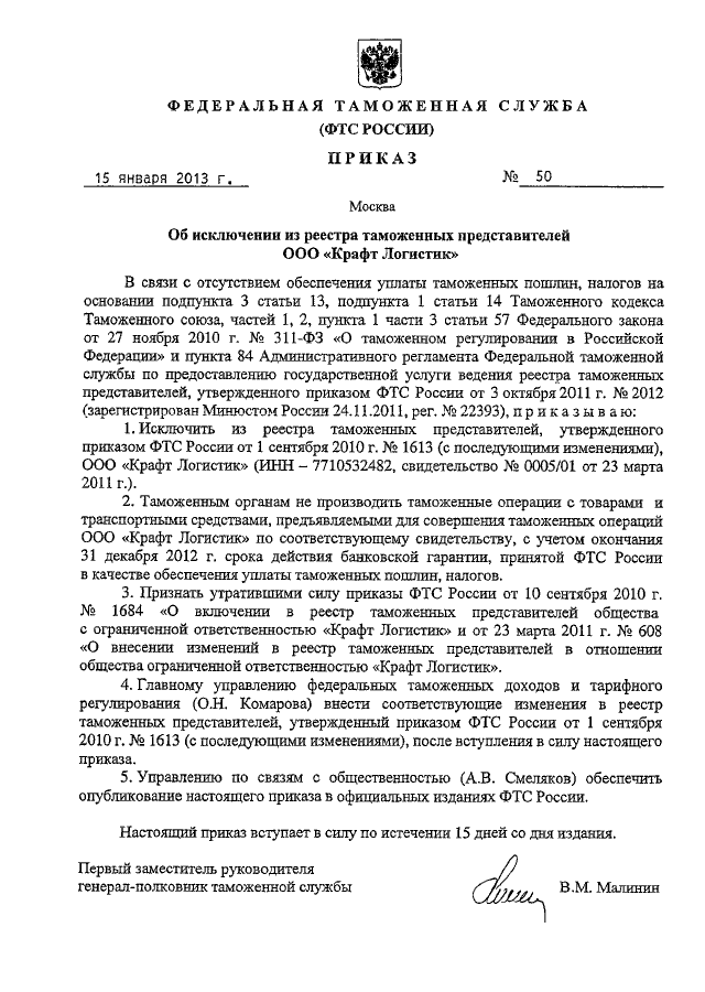 ПРИКАЗ ФТС РФ от 15.01.2013 N 50