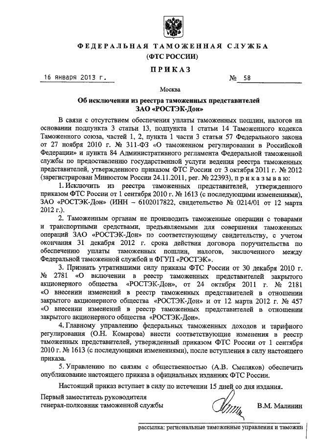 ПРИКАЗ ФТС РФ от 16.01.2013 N 58