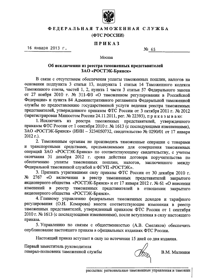 ПРИКАЗ ФТС РФ от 16.01.2013 N 65
