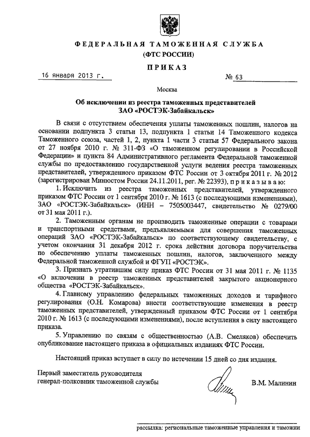 ПРИКАЗ ФТС РФ от 16.01.2013 N 63