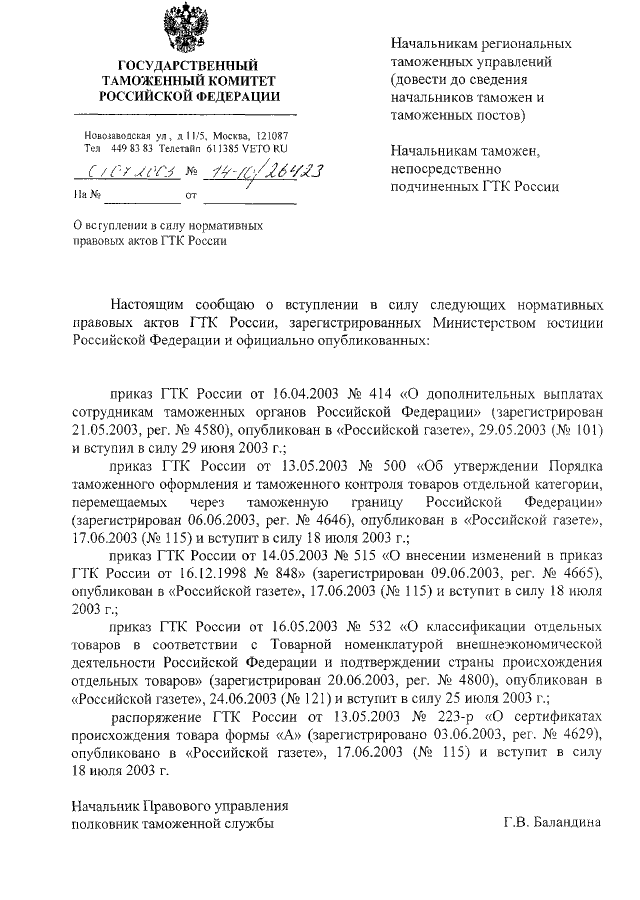 ПИСЬМО ГТК РФ от 01.07.2003 N 14-10/26423