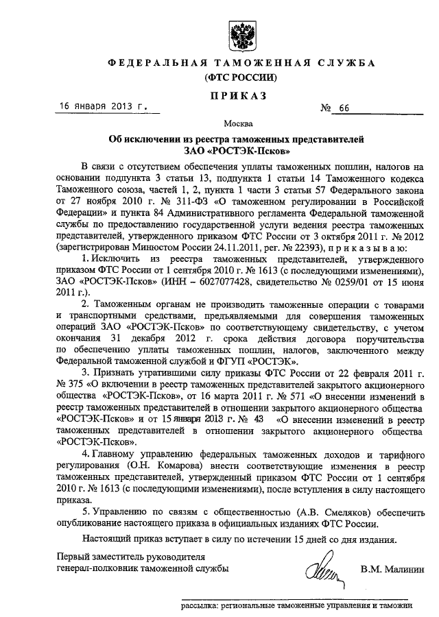 ПРИКАЗ ФТС РФ от 16.01.2013 N 66