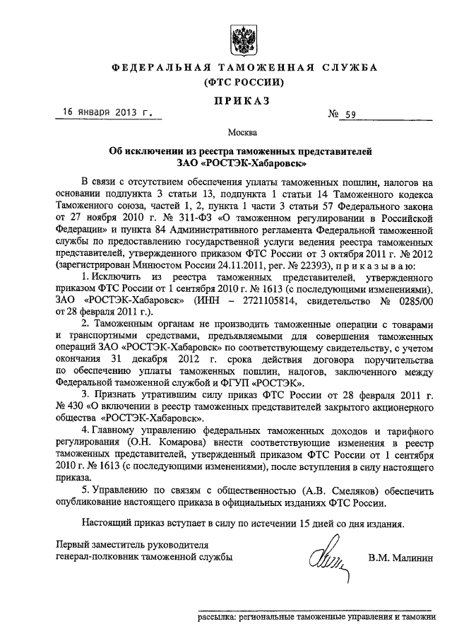 ПРИКАЗ ФТС РФ от 16.01.2013 N 59