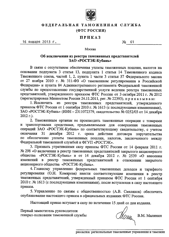 ПРИКАЗ ФТС РФ от 16.01.2013 N 61