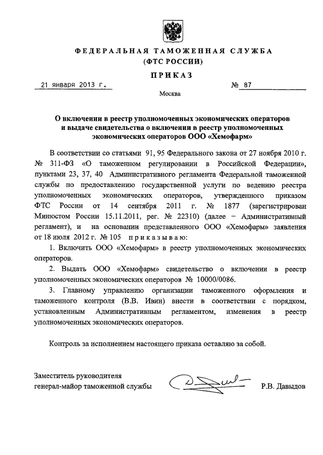 "О ВКЛЮЧЕНИИ В РЕЕСТР УПОЛНОМОЧЕННЫХ ЭКОНОМИЧЕСКИХ ОПЕРАТОРОВ И ВЫДАЧЕ СВИДЕТЕЛЬСТВА О ВКЛЮЧЕНИИ В РЕЕСТР УПОЛНОМОЧЕННЫХ ЭКОНОМИЧЕСКИХ ОПЕРАТОРОВ ООО "ХЕМОФАРМ"