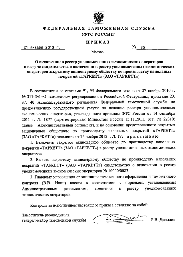ПРИКАЗ ФТС РФ от 21.01.2013 N 85 "О ВКЛЮЧЕНИИ В РЕЕСТР УПОЛНОМОЧЕННЫХ ЭКОНОМИЧЕСКИХ ОПЕРАТОРОВ И