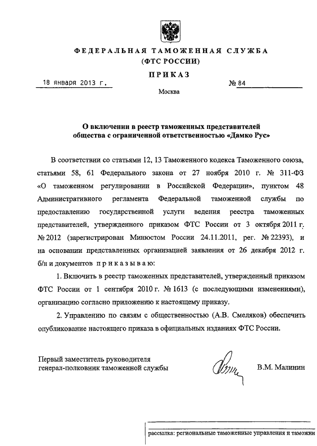 ПРИКАЗ ФТС РФ от 18.01.2013 N 84