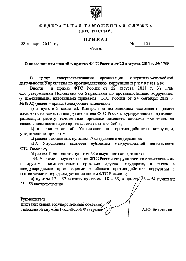 ПРИКАЗ ФТС РФ от 22.01.2013 N 101