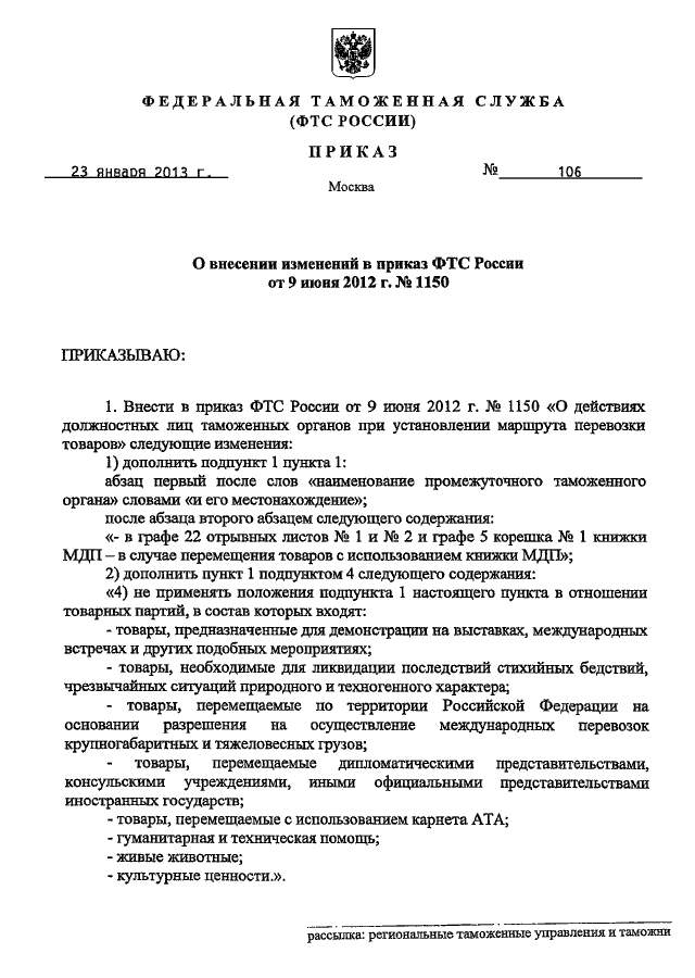 ПРИКАЗ ФТС РФ от 23.01.2013 N 106