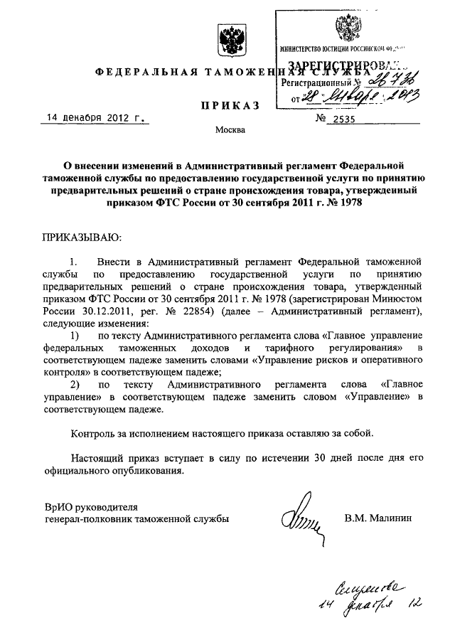 ПРИКАЗ ФТС РФ от 14.12.2012 N 2535 "О ВНЕСЕНИИ ИЗМЕНЕНИЙ В АДМИНИСТРАТИВНЫЙ РЕГЛАМЕНТ ФЕДЕРАЛЬНОЙ