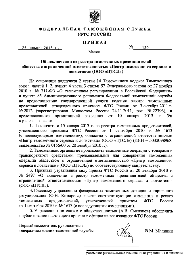 "ОБ ИСКЛЮЧЕНИИ ИЗ РЕЕСТРА ТАМОЖЕННЫХ ПРЕДСТАВИТЕЛЕЙ ОБЩЕСТВА С ОГРАНИЧЕННОЙ ОТВЕТСТВЕННОСТЬЮ "ЦЕНТР ТАМОЖЕННОГО СЕРВИСА И ЛОГИСТИКИ" (ООО "ЦТСЛ")"