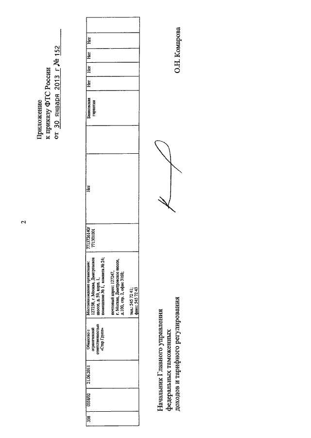 ПРИКАЗ ФТС РФ от 30.01.2013 N 152