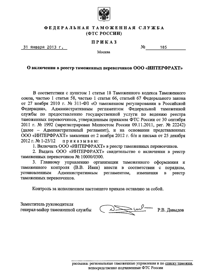 ПРИКАЗ ФТС РФ от 31.01.2013 N 185