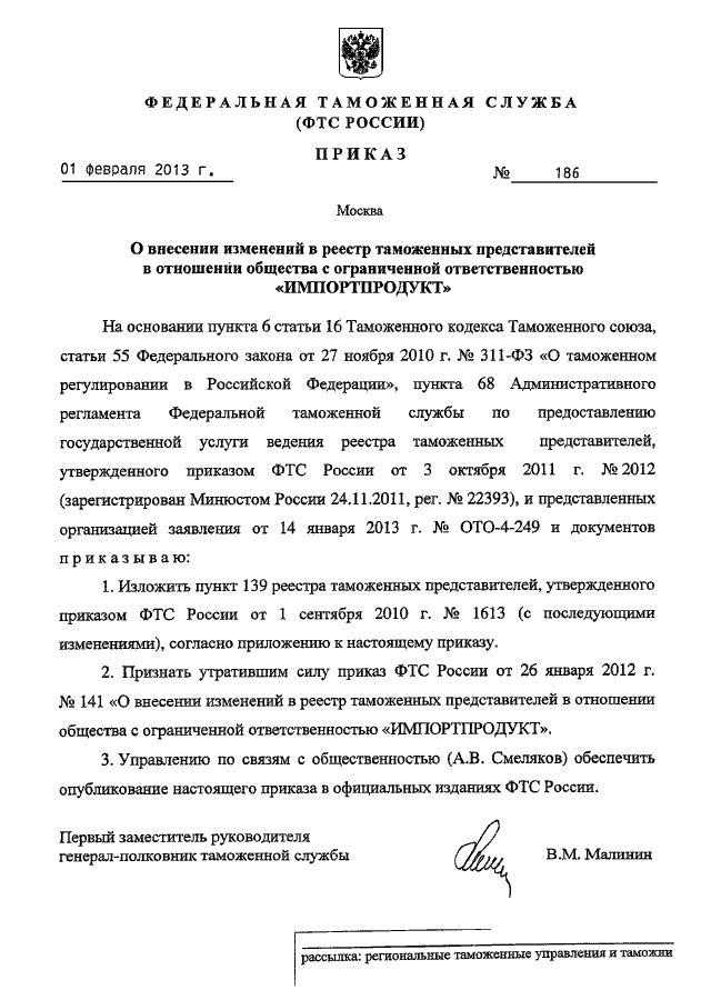 ПРИКАЗ ФТС РФ от 01.02.2013 N 186
