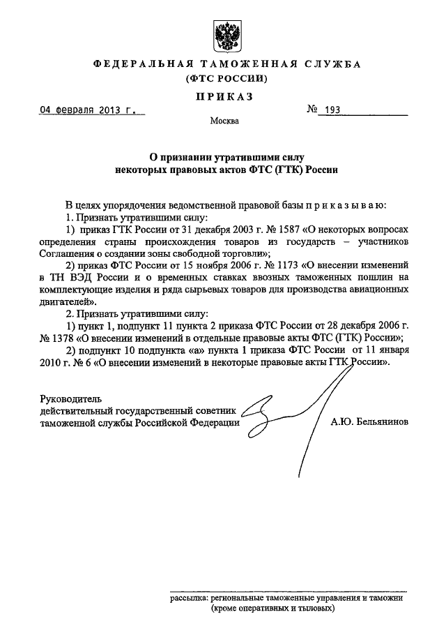 ПРИКАЗ ФТС РФ от 04.02.2013 N 193