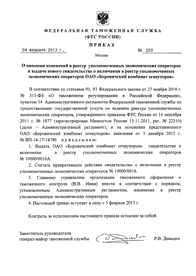 "О ВНЕСЕНИИ ИЗМЕНЕНИЙ В РЕЕСТР УПОЛНОМОЧЕННЫХ ЭКОНОМИЧЕСКИХ ОПЕРАТОРОВ И ВЫДАЧЕ НОВОГО СВИДЕТЕЛЬСТВА О ВКЛЮЧЕНИИ В РЕЕСТР УПОЛНОМОЧЕННЫХ ЭКОНОМИЧЕСКИХ ОПЕРАТОРОВ ОАО "БОРОВИЧСКИЙ КОМБИНАТ ОГНЕУПОРОВ"