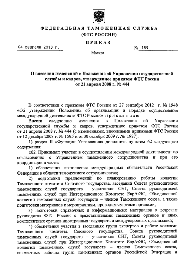 ПРИКАЗ ФТС РФ от 04.02.2013 N 189