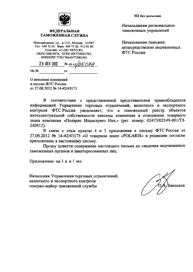 "О ВНЕСЕНИИ ИЗМЕНЕНИЙ В ПИСЬМО ФТС РОССИИ ОТ 27.08.2012 N 14-42/43173"
