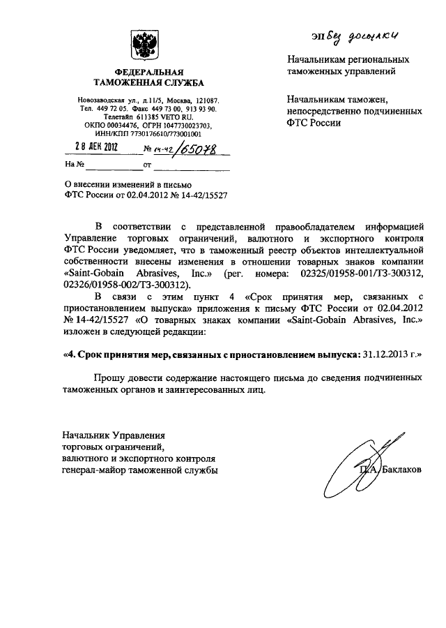 ПИСЬМО ФТС РФ от 28.12.2012 N 14-42/65078