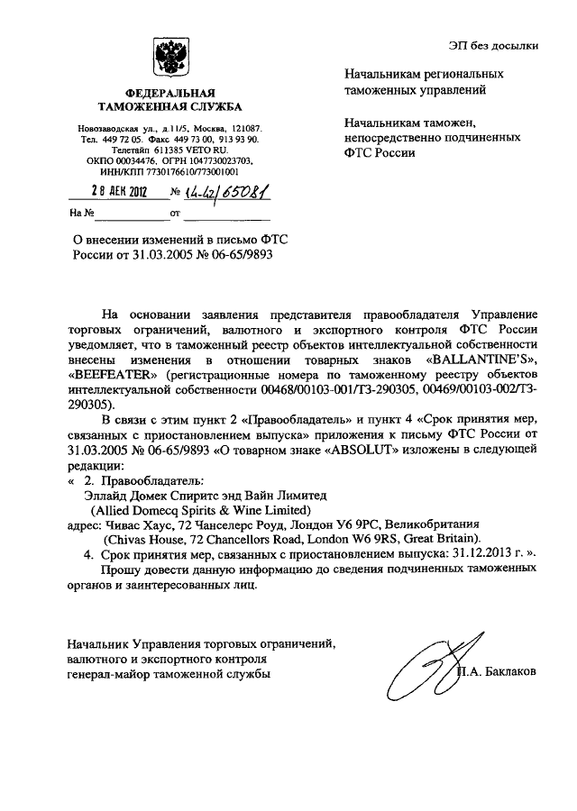 ПИСЬМО ФТС РФ от 28.12.2012 N 14-42/65081