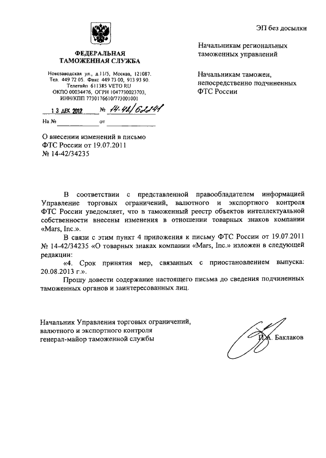 ПИСЬМО ФТС РФ от 13.12.2012 N 14-42/62241