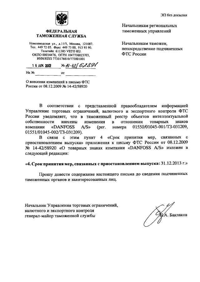 ПИСЬМО ФТС РФ от 18.12.2012 N 14-42/62891